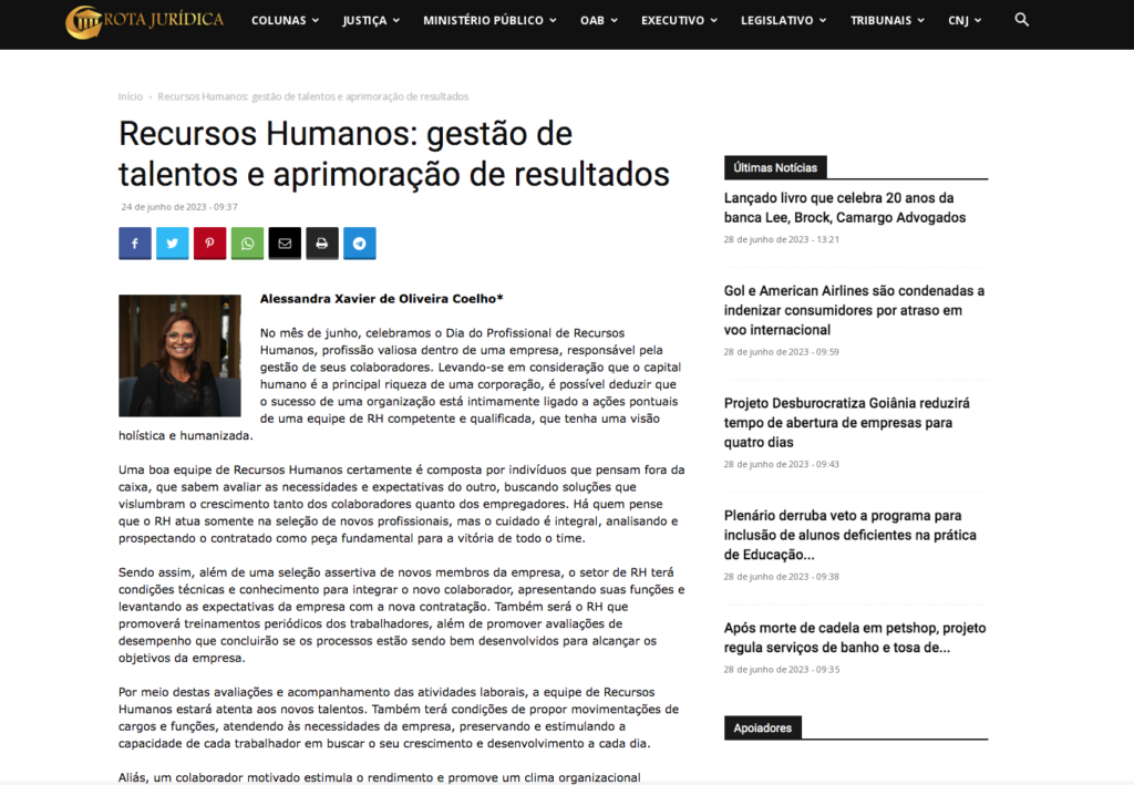 Foi publicado no portal Rota Jurídica, artigo da sócia Alessandra Coelho. Vejam e compartilhem pelo link abaixo: Recursos Humanos: gestão de talentos e aprimoração de resultados