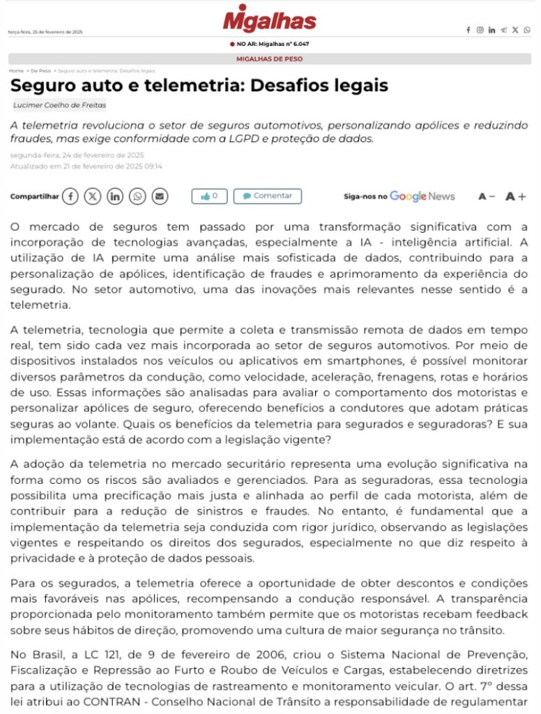 Foi publicação no portal jurídico Migalhas, artigo da sócia Lucimer Coelho, falando sobre seguro auto e telemetria. Veja pelo link abaixo: https://www.migalhas.com.br/depeso/425090/seguro-auto-e-telemetria-desafios-legais