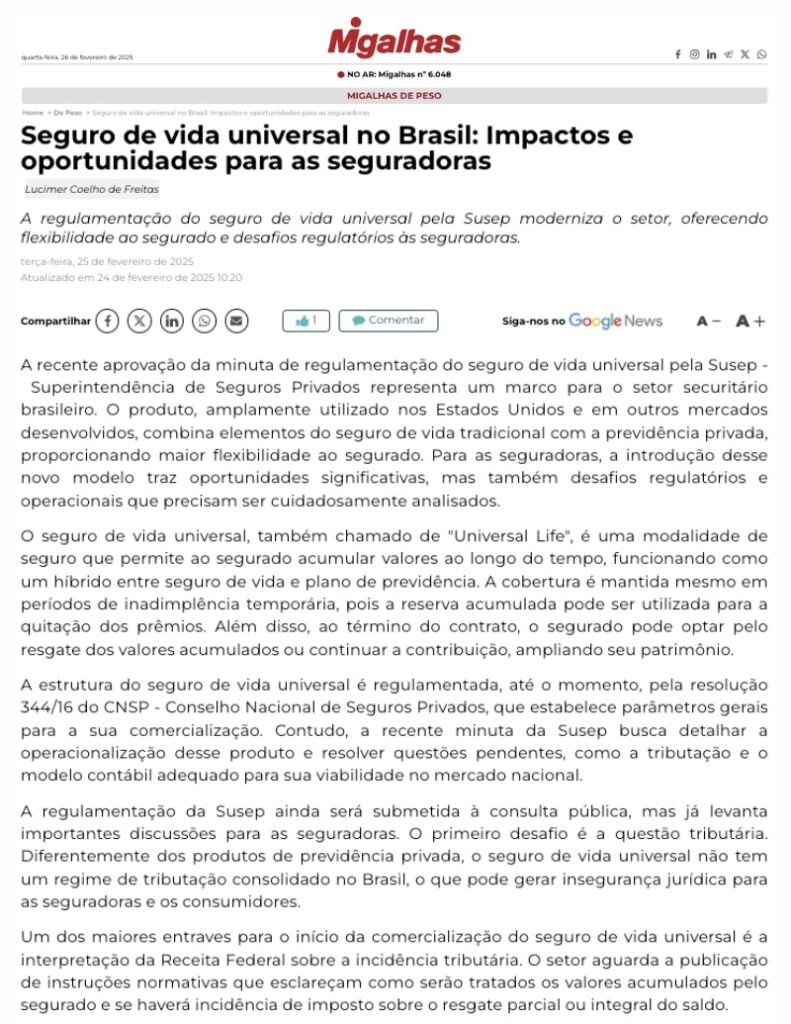 Foi publicado no portal jurídico Migalhas, artigo opinativo da sócia Lucimer Coêlho, falando sobre seguro de vida universal. https://www.migalhas.com.br/depeso/425220/seguro-de-vida-universal-no-brasil-impactos-para-as-seguradoras