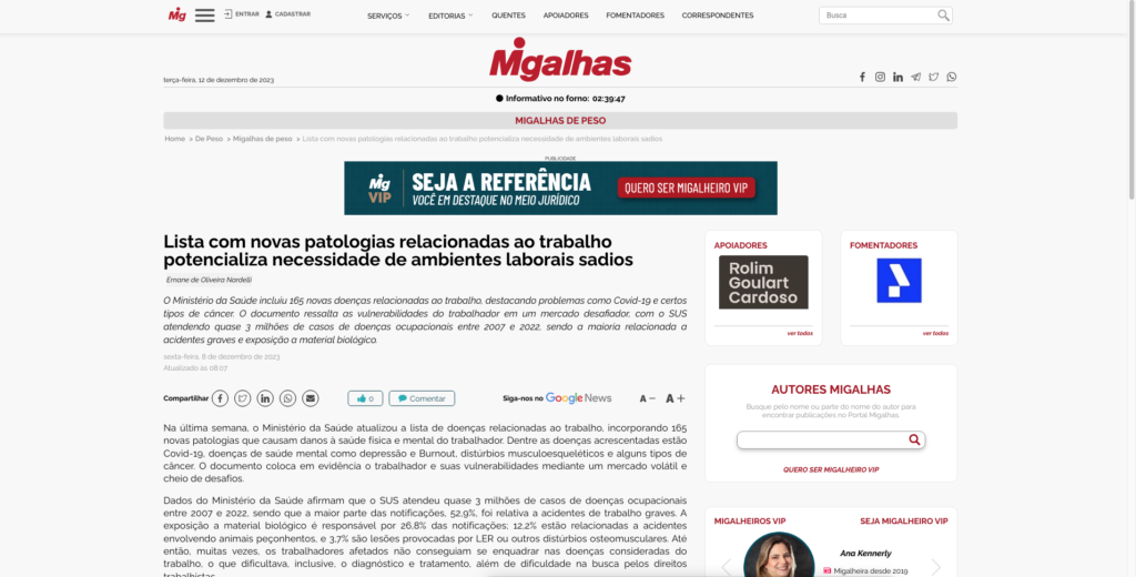 Foi publicado no portal Migalhas, artigo do sócio Ernane Nardelli falando sobre novas doenças relacionadas ao trabalho que foram incluídas no Ministério da Saúde. Vejam no link abaixo: https://www.migalhas.com.br/depeso/398650/lista-com-novas-patologias-relacionadas-ao-trabalho