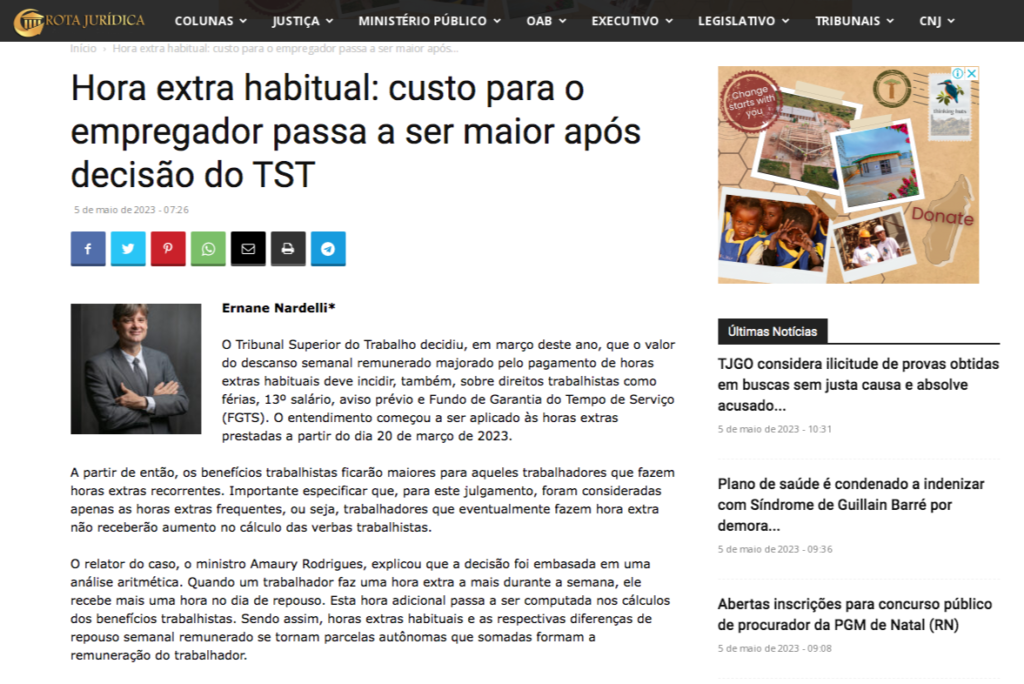 Foi publicado no portal Rota Jurídica, artigo sobre horas extras do sócio Ernane Nardelli. Vejam e compartilhem pelo link abaixo: Hora extra habitual: custo para o empregador passa a ser maior após decisão do TST