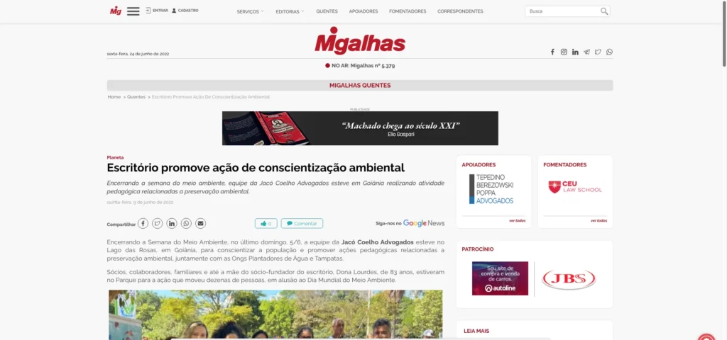 Nossa participação na ação de conscientização ambiental também foi divulgada no Rota Jurídica: Encerrando a Semana do Meio Ambiente, no dia 5 de junho, a equipe da Jacó Coelho Advogados esteve no Lago das Rosas em Goiânia para conscientizar a população e promover ações pedagógicas relacionadas a preservação ambiental, juntamente com as Ongs Plantadores de Água e […]